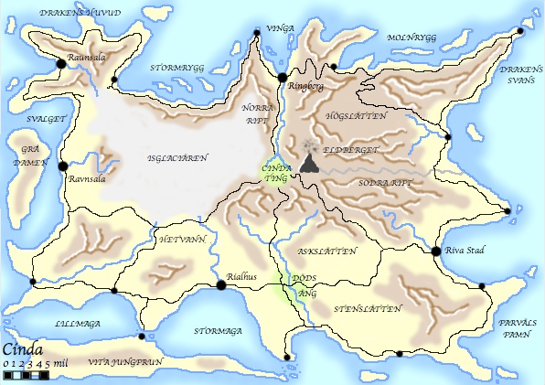 De vandrade genom ett härjat och förött landskap. Marken de beträdde var kal och fruktlös och täckt av skarpa stenar vars kanter trängde genom deras skodon så att varje steg smärtade. På deras högra sida kastade sig vilda vågor mot branta klippor och på deras vänstra sida reste sig höga och skrovliga bergssidor. I fjärran otillgängliga skrevor kunde gröna fläckar skönjas där ensamma får gick och betade men i övrigt tycktes såväl växter som djur sällsynta på denna ö. Det var ett döende landskap, ett landskap där livet tycktes ha flytt men döden ännu inte bemödat sig göra slut på lidandet. Var detta cindariernas stolta urhem? Var detta det mytomspunna Cinda?